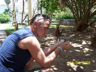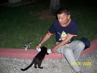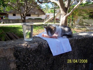 Fidel war ein kleiner Kater, der eines Tages, in der Hotelanlage auftauchte. Ein Junge hatte ihn aus einer anderen Anlage einfach mit genommen, so das er nun völlig allein war. Die anderen Katzen ignorierten ihn und man merkte, das er Nähe suchte. Wir konnten ihn nicht seinem Schicksal überlassen und so haben wir uns um ihn gekümmert. Nach dem er ein wenig aufgepäppelt war, wurde er sehr munter und quietschfidel, daher der Name Fidel. Versuche unsererseits, ihn der Gastmama unter zu schieben, wurden von ihr ignoriert. Daher mussten wir die Rolle seiner Familie übernehmen und haben ihn mit Essen versorgt. Sein Schicksal blieb nicht unbemerkt, so das sich auch andere Hotelgäste und das Hotelpersonal ( ich danke den Cubaner für ihre Tierliebe) um ihn kümmerten. Vor unserer Abreise übertrugen wir seine weitere Pflege an ein tierliebes Ehepaar, welche versprachen sich um ihn zu kümmern. Wir hätte ihn gerne mit zu uns genommen, da er uns doch sehr ans Herz gewachsen war, aber der Aufwand wäre zu gross und die Frage, ob unsere Katzen ihn aktzeptiert hätten war zu ungewiss! |